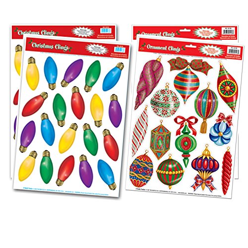 Christmas Window Film Decorations - 4 Large Sheet Sets Featuring Christmas Ornaments and Light Bulbs