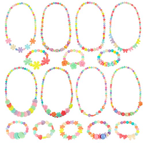 Features: Quantity: Each order comes with 8 sets of little girl jewelry, each set includes 1 piece bracelet and 1 piece necklace. 8 Different styles: A variety of styles to match your outfit, makes your princesses become more lovely. Multicolor: Each dress up jewelry is made of colorful acrylic beads, no smell and non-discoloring; The colors of beads have pink, blue, white, red, purple and so on, various colors mix together and look so beautiful. Easy to wear: Colorful beads are strung on stretchable strings, makes the little girl costume jewelry more durable and easier to be put on. Size: Necklace perimeter: about 42 cm/ 16.5 inch; Bracelet perimeter: about 14 cm/ 5.5 inch; With elastic cord, sizes can stretch to fit for most kids and girls. Usage: Beautiful accessories to dress up your girls for birthday parties, princess themed party, little girls dress up, beach dress, costume party and other fun occasions. Specifications: Material: acrylic, elastic Color: multiple colors Necklace perimeter: about 42 cm/ 16.5 inch Bracelet perimeter: about 14 cm/ 5.5 inch Quantity: 8 pieces girls bracelets and 8 pieces girls necklaces Package includes: 8 x Girls costume jewelry set 0