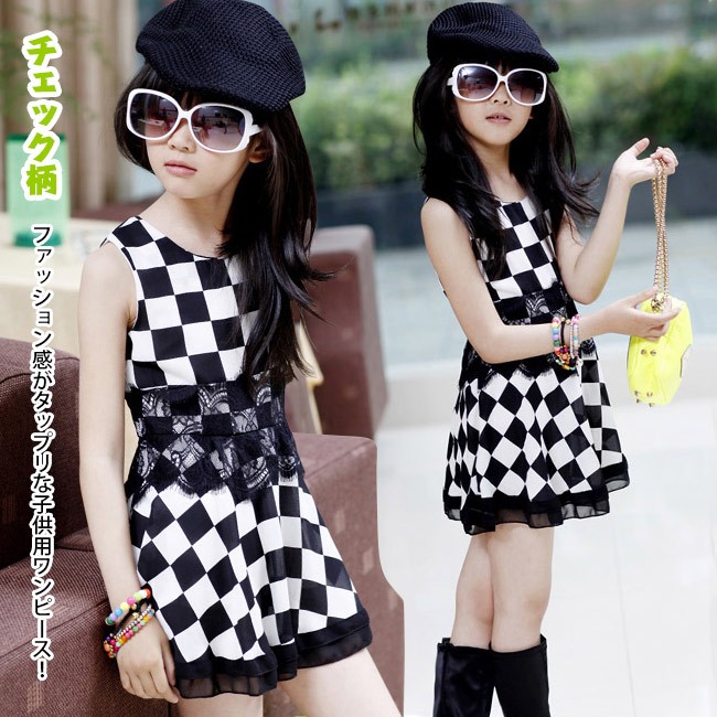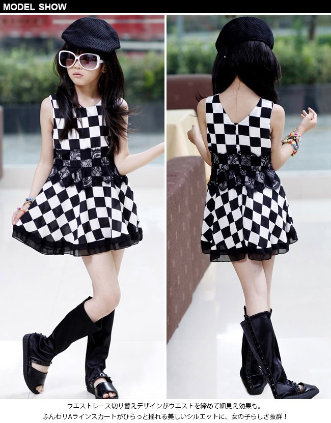 ホワイトとブラックのチェック柄の相性が絶妙で、ちょっと大人っぽい感じを♪ ファッション感がタップリな子供用ワンピース! ウエストレース切り替えデザインがウエストを締めて細見え効果も。 ふんわりAラインスカートがひらっと揺れる美しいシルエットに、女の子らしさ抜群! シフォン素材は爽やかで着心地もいい。 涼しげな夏らしい気分を盛り上げます。 普段着はもちろん、発表会や結婚式などのフォーマルの場合もオススメ☆ | |