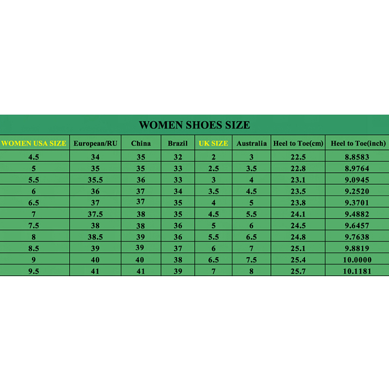 WOMEN USA SIZE European/RU China Brazil UK SIZE Australia Heel to Toe(cm) Heel to Toe(inch)