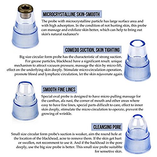 - COMEDO SUCTION, SKIN TIGHTING: Big size circular form probe has the characteristic of strong suction. For grease particles, blackhead have a significant result. unique mechanism to attract vacuum pressure, massage the skin by micro-lift, effect on the underlying skin deeply. Stimulate micro-circulation operation, promote blood and lymphatic circulation, let the skin rejuvenate again.