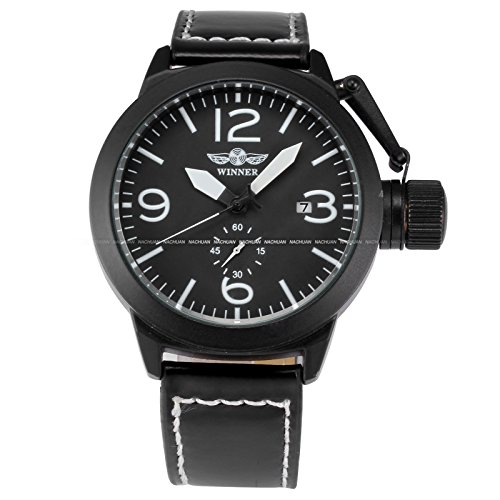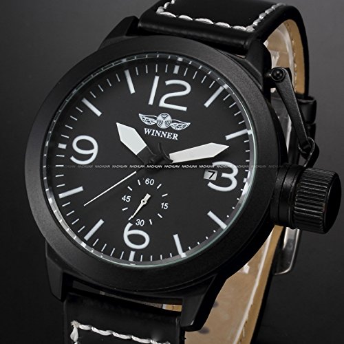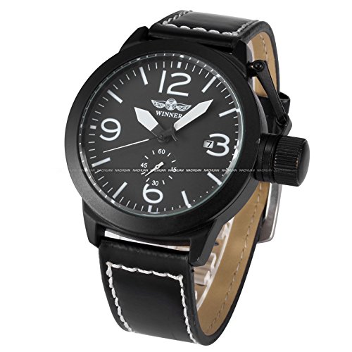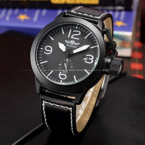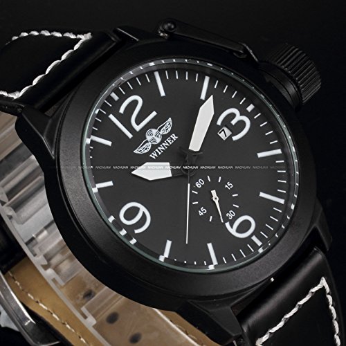 상품명: New WINNER 맨즈 자동 감기 자동기계 식날짜 블랙 레더 아날로그 손목시계PMW273