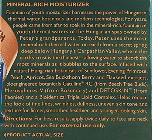 This fountain of youth moisturizer harnesses the power of Hungarian thermal water, botanicals and modern technologies. For years, people came from afar to soak in the mineral-rich, fountain of youth thermal waters of the Hungarian spas owned by Peters grandparents. Today, Peter uses the most mineral-rich thermal water on earth from a secret spring deep below Hungarys Carpathian Valley, where the earths crust is the thinnestallowing water to absorb the most minerals as it bubbles to the surface. Infused with natural Hungarian botanicals of Sunflower, Evening Primrose, Peach, Apricot, Sea Buckthorn Berry and Flaxseed extracts, bioengineered botanicals Gatuline RC (from Beech Tree Buds), Merospheres-V (from Rosemary) and DETOSKIN (from Peonies) and a Bioidentical Triple Lipid Complex. Helps reduce the look of fine lines, wrinkles, dullness, uneven skin tone and texture for firmer, smoother, healthier and younger-looking skin. 1.7 ozFeature