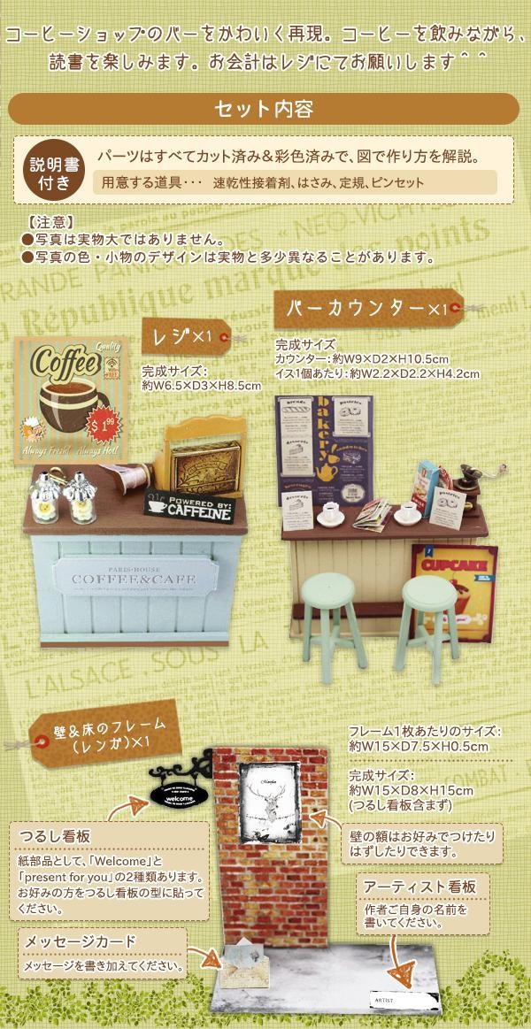 コーヒーショップのバーをかわいく再現したミニチュアキットです。コーヒーを飲みながら、読書を楽しめるバーカウンターやおしゃれな小物で、まるで映画のようなコーヒーショップを演出。小物の配置次第で自分だけのショップの完成です。分かりやすい説明書付きなので、初心者の方でも楽しく簡単に作ることができます。 |
