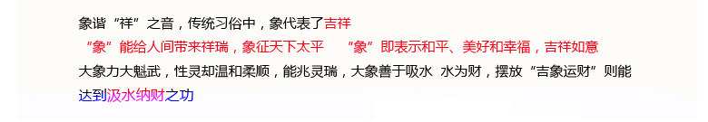 象”即表示和平、美好和幸福。大象高大魁悟,性格却温和柔顺,相传象为摇光之星生成,能兆灵瑞。