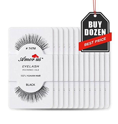 Amorus 12 Pairs Multipack #747M False Eyelashes Dozen Set 100% Natural Hair Black Handmade Comfortable Reusable Fake Lashes Pack