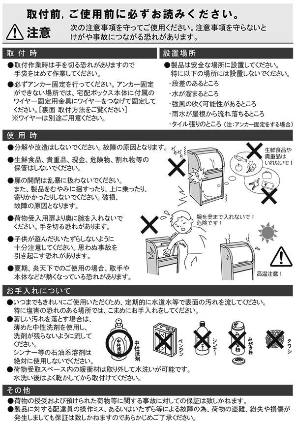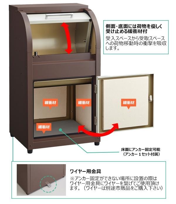 | 仕様 | 完成品 対応荷物サイズ:80サイズ(幅350×奥行260×高さ190mm)まで 対応荷物重量:5kgまで 屋外・屋内対応 |