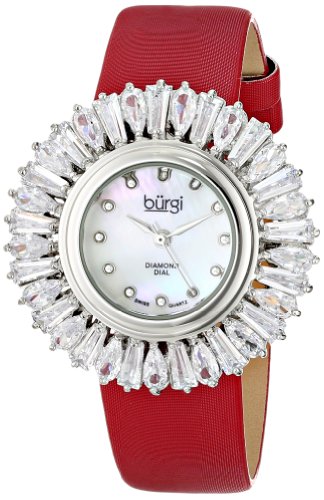 ReleaseDate : 2014-01-15 Studio : Burgi Publisher : Burgi Binding : Watch Product Description Stainless steel case with a red leather strap. Fixed silver-tone bezel set with baguette crystals. Mother of pearl dial with silver-tone hands and diamond hour markers. Dial Type: Analog. Quartz movement. Scratch resistant mineral crystal. Pull / push crown. Snap-down case back. Case diameter: 38 mm. Case thickness: 9 mm. Round case shape. Band width: 16 mm. Band length: 7.5 inches. Tang clasp. Water resistant at 10 meters / 33 feet. Functions: hour, minute, second. Casual watch style. Watch label: Hong Kong. Burgi Red Baguette Crystal Bezel Mother of Pearl Dial Ladies Watch BUR092RD. 0