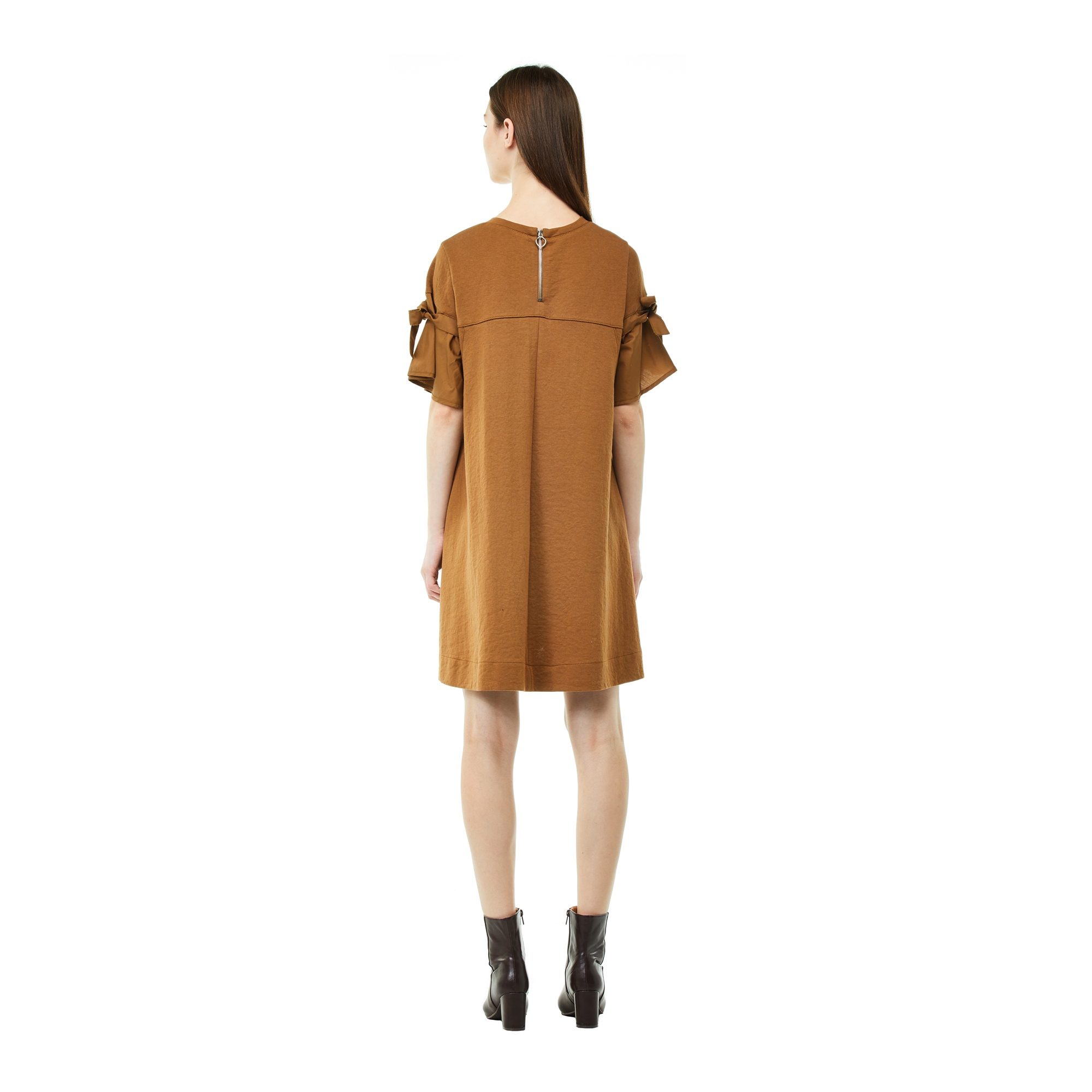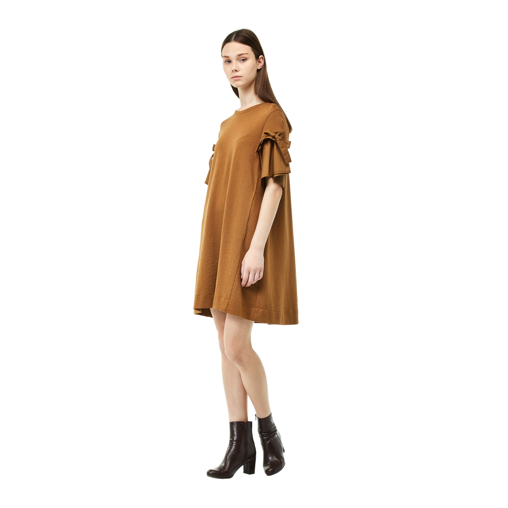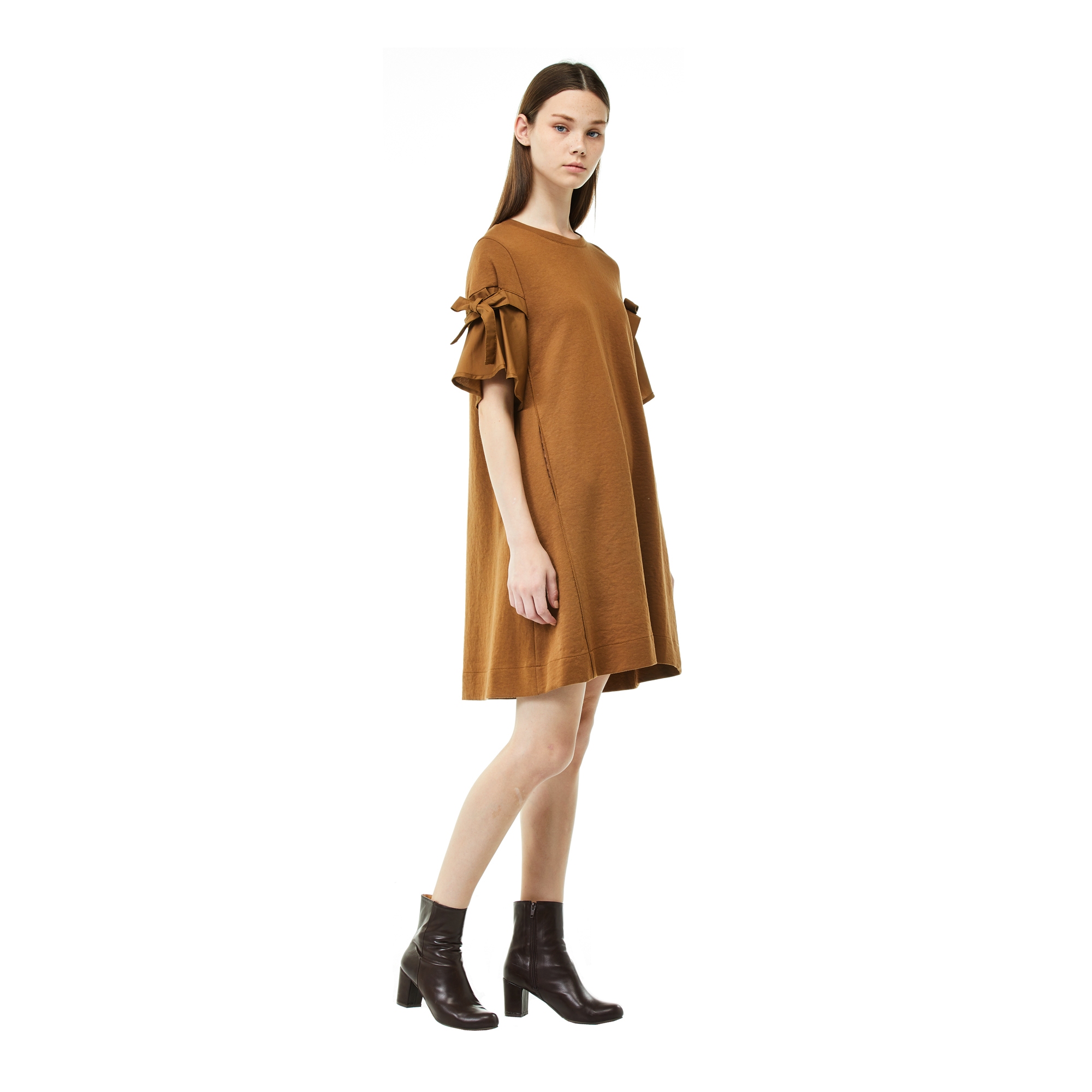 컬렉션 : 2017 Fall/Winter 디자인 포인트 : - 소매에 리본 장식 디테일로 페미닌한 느낌을 주는 플레어핏 원피스- 라운드넥 디테일의 베이직한 핏을 가진 디자인- 면 혼방 소재로 편안한 착용감을 자랑하는 아이템 스타일링 추천 : 단독으로 미니멀한 악세서리와 스니커즈를 매치하여 캐주얼한 페미닌룩 스타일링을 할 수 있음