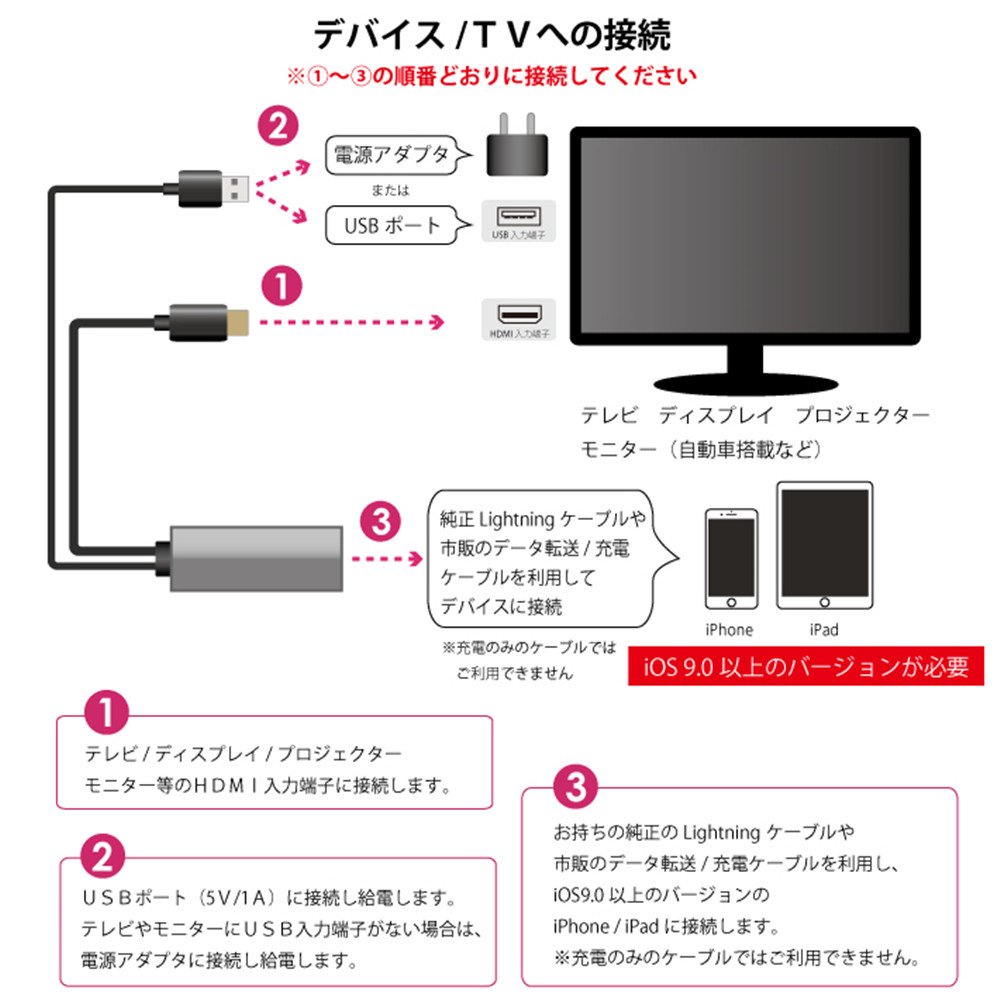 This Lightning to HDMI conversion cable supports all iPhone / iPad / iPod.