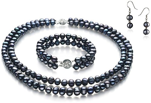 You're sure to love this set of double-strands of black freshwater cultured pearls for nearly any occasion you choose. This set is part of hand selected selection of gorgeous freshwater white cultured pearls. You will adore the flexibility of the 6 to 7mm size. Perfect for both casual and formal events. This set consists of a beautiful 6 to 7mm white cultured pearl necklace, accompanied by a matching cultured pearl bracelet and a pair of sterling silver post mounted cultured pearl earrings, Included are matching butterfly backs to secure the fine and beautiful earrings. and brass double clasps. The bracelet default length is 7 inches, and the necklace default length is 16 inches for the inner strand and 17 inches for the outer strand. However, you may order any length you choose. Cultured pearls are playful with light, and depending on the light conditions you view them at, they will present a slightly different color - a fascinating phenomenon. We invite you to look at your cultured pearls in bright sunlight, on a cloudy day and inside your home. The change of color you will see will surprise and amaze you. We hope you enjoy the natures beauty and its unique color spectrum that cultured pearls offer.