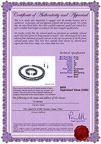 Included FREE with your cultured pearls set is an Appraisal Certificate prepared by a Pearl Expert describing in detail your set size, color and body shape. A color picture of your set is shown on each certificate to ensure carefree insurance claims should those ever arise. It is a wonderful keepsake that shows you truly care.