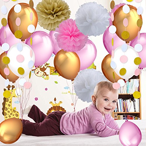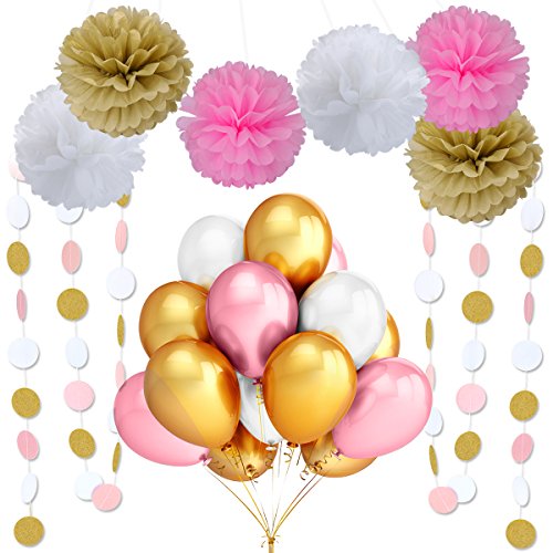 -. Feature : SUFFICIENT PARTY DECORATION SUPPLIES: LeeSky 100 pack gold & pink & white color latex ballons,6 Pack paper pom poms flowers,1 pack Gold & Pink & White Color Circle Dots Banner,Every thing you need for a perfect birthday party decorations. / PERFECT FOR ALL OCCASIONS: Perfect for birthday,weddings celebration,Reunion's carnival parties,engagement,bridal shower,NEW YEAR party,golden years party,holiday party,baby shower,chritmas parties,anniversary celebrations,dances,black and white party,birthday parties,going away party,or any party you can image. / CIRCLE DOTS BANNER AND PAPER POM POMS FLOWERS: This Glittery Gold & Pink & White Circle Dots Banner Diameter: 2 inch. in total 25 pcs Circle Dots. Paper pom poms flowers: 2 pcs 10 inch gold flowers,2 pcs 10 inch pink flowers,2 pcs 10 inch white flowers. / LONG LASTING AND STRONG: LeeSky Gold & Pink & White color latex balloons are made from durable latex material,our Gold & Pink & White color party balloons are strong and long lasting, and you won't have to worry about them tearing or bursting when inflated. / 100% SATISFACTION MONEY BACK GUARANTEE - NO CONDITIONS - Your Satisfaction Is Guaranteed.