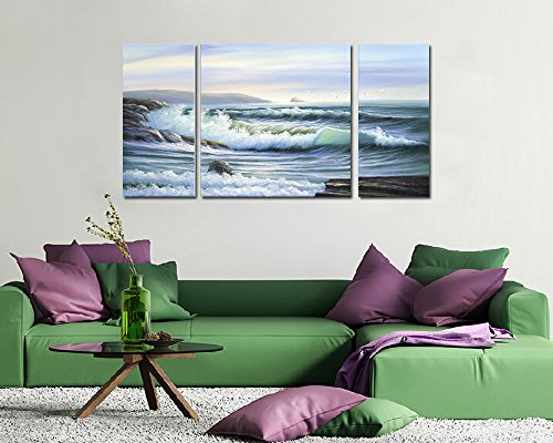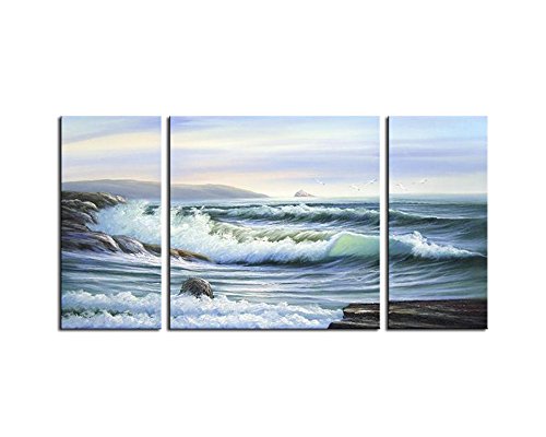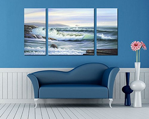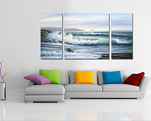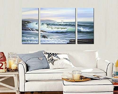 -. Title : Noah Art-Blue Ocean Waves 100% Hand Painted Beach Paintings on Canvas Wall Art and Decor, Large 3 Panel Framed Stretched Seascape Paintings, Ready to Hang for Bathroom Wall Decorations