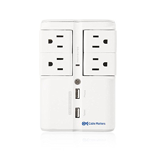 Surge suppressor with 4-rotating outlets that can each rotate 90 degrees accommodates different types of power cords or adapters and provide better cable management