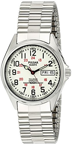 Web exclusive! You're right on track in a Pulsar Men's Silvertone Lumibrite Dial Expansion Watch. With quartz movement and railroad-approved accuracy, this water-resistant timepiece is a must for the busy guy with places to be. The luminous dials of these wristwatches glow after exposure to any light source for added reliability.