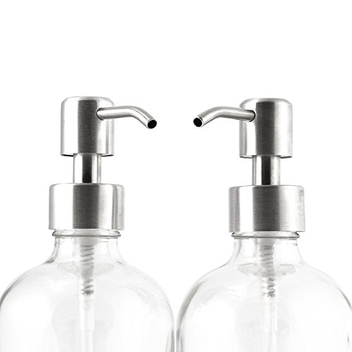 Glass Bottles with Stainless Steel Pump Nozzles (2 Pack); Empty Boston Round Bottles Ideal for Lotion & Liquid Soap (16 oz, Clear)