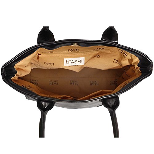 This Handbag by FASH is the best accessory for every working woman. This spacious tote has been designed keeping in mind the essentials that a woman carries to work on a daily basis, which includes cosmetic pouch, mobile, wallet etc. This bag features Dual Rolled Tote Handles with 9.4"" Drop, Gold-tone Magnetic Snap Button Closure, Fabric Lined Interior with one zippered and two open/mobile wall pockets.