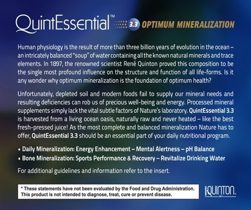 QuintEssentialTM 3.3 is the original Quinton HypertonicTM product packaged in easy-to-open ampules. It is excellent for use when an immediate revitalizing effect is desired. Unlike Original Quinton Isotonic, which contains the same mineral concentration as the blood, Quintessential bioterrain 3.3 is meant to provide higher concentrated minerals for an immediate revitalizing effect.