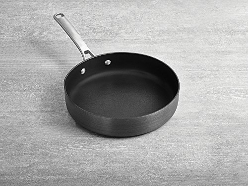 The Calphalon Classic Nonstick 14-Piece Cookware Set features pots and pans with convenient fill lines, straining covers, and pour spouts to help you save time in the kitchen. Pans are made with dual-layer nonstick for extra-easy food release and cleanup, and are constructed from durable hard-anodized aluminum for fast and even heating. The 14-piece non stick Calphalon cookware set includes an essential assortment of cookware for your kitchen.Feature