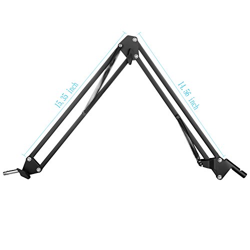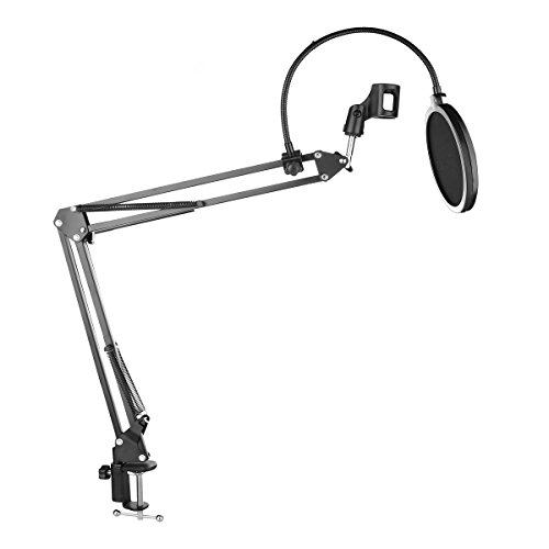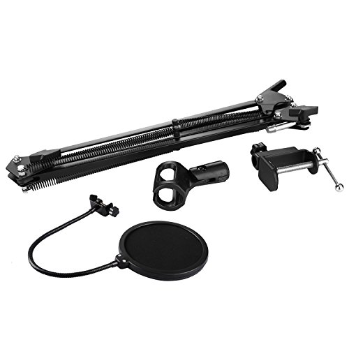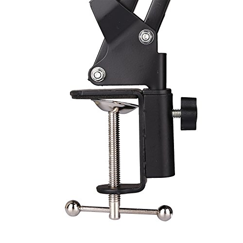 -. Feature : Material of the Scissor arm: Steel / Microphone arm with solid gripping clamp, can strongly clip to any desktop up to 1.7"/4.5cm thic, max load: Approx 53oz / 2KG / This mic stand with super-strong sP.R.Ing you can easily and adjust the suitable angle & height to show your perfect voice / Pop filter with double nylon net prevent popping, flexible metal gooseneck and adjustable swivel mount / Mic boom arm suitable for any stores, families, stages, studios, broadcasting and TV stations, etc
