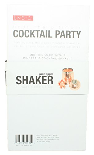 Studio : Silver One International Publisher : Silver One International Product Description GREAT CHRISTMAS GIFT IDEASHAKING IT UP PINEAPPLE STYLE - This 3-piece stainless steel cocktail set is all a home entertainer or bartender needs to craft fine cocktails. The set includes a high quality cocktail shaker (25 OZ) - all the essential accoutrements for drink mixing. Entertain guests and enjoy perfect drinks for yourself with this must-have set for any bar.QUALITY High quality stainless steel, Tarnish resistant finish INSTRUCTIONS FOR USE - 1. Place your serving glass (not included) in the freezer for 5 minutes2. Prepare your cocktail recipe, using the double jigger to measure your liquor or spirits3. Remove the pineapple lid of the cocktail shaker. Add ice to the mixing tin, Fill so that the container is 2/3 to 3/4 full of ice4. Place the lid with the built-in strainer on top of the mixing tin. Place the second small lid over the strainer. Tap it with the heel of your hand to seal it. Make sure it's sealed firmly5. Shake the drink until water begins to condense on the outside of the shaker. The condensation will tell you that your drink is sufficiently chilled6. Remove the small lid and pour the drink through the strainer into your chilled serving glass. Alternatively, remove both lids on the cocktail shaker and place the hawthrone strainer over the top of the shaker to strain the cocktail while pouring it into your chilled glassVERSATILE - You can use this cocktail shaker stainless steel model to create drinks made from a wide variety of liquors including: Whiskey, Scotch, Vodka, Tequila, Gin, Rum, Brandy, Sake and more. You can also use any mixers you want. That's why this cocktail shaker is the ultimate bartender tool! 0