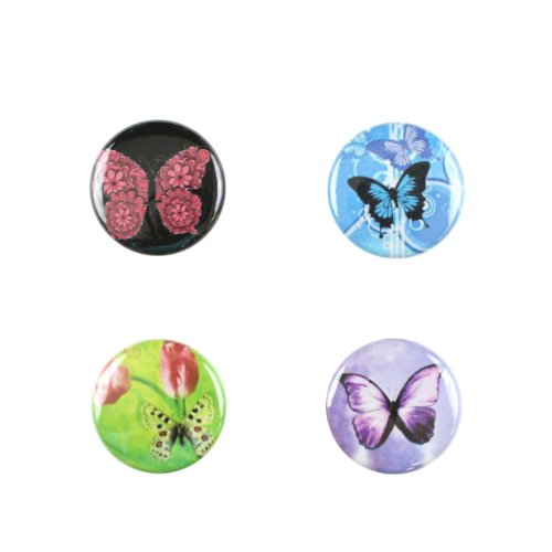 -. Feature : Set of 4 butterflies magnetic wine and drink charms; a unique way to "mark your drink"; works with any glass / Features extra strong coated rare earth magnet, tin plated steel, recycled paper, mylar coating; packaging can be used for charm storage / Magnets are safe, won't come apart unless the outside charm is removed; won't affect the taste of the beverage / To use: drop magnet in glass, hold charm to outside of glass or base until two magnets attract, slide to desired position, pour beverage / Wipe clean with damp cloth; do not soak in water; made and assembled in USA