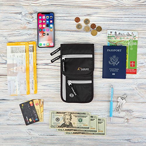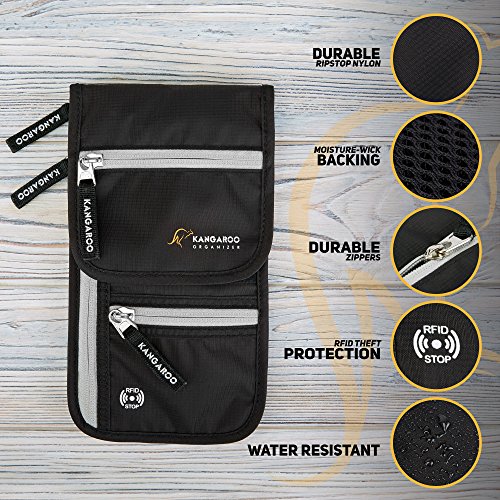 Protect your personal data from theft with RFID blocking,which is provided by the Kangaroo Organizer travel neck wallet. The RFID system blocks data from being read from your ID or credit cards. Identity theft is very common today, so use our travel neck wallet with RFID and you will have no reasons to worry. Our neck wallet for travel is made of quality material - Waterproof Ripstop Nylon 210. Each wallet undergoes quality testing after being manufactured. Each travel passport wallet bag reliably protects contents from scanning, moisture and dust, as well as damage. For the most simple and convenient organization, the crossbody bag for women and men has a large number of pockets of different size and shape - there is an ideal compartment for each document or card you have. The material is pleasant to the touch, does not rustle, and can be worn under clothes or on the outside - no discomfort. All fastenings and locks are durable, and the lace is one-piece (stitched inside). Using this anti-theft wallet with RFID is so easy and convenient that you won't want to take it off! The attractive appearance, quality materials, comfort and functional design will appeal to all. The travel passport holder/neck stash wallet by Kangaroo Organizer is an excellent gift for men, women and teenagers. Compact size: 8.7 x 4.7 inches. This is the optimal size, and all your documents will fit in it. At the same time, the travel pouch can be worn around your neck and remains invisible under clothes. Gift. We offers a bonus headphones cover that you will receive along with the ordered travel passport holder/security pouch wallet with RFID blocking. Keeping order, having security and organizing your things in the best way is always easy with our organizer! 0 |