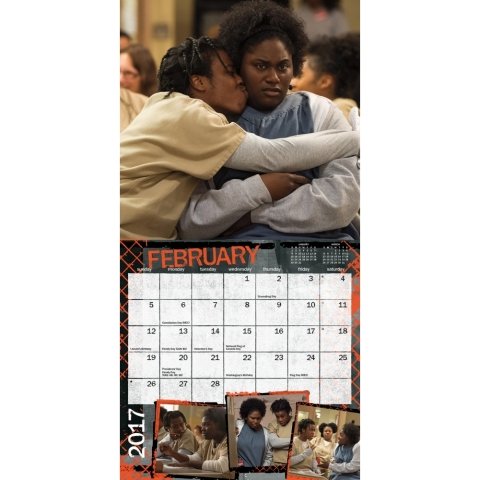 This Orange Is The New Black calendar includes large grids to mark appointments and events. 2017 calendar observes major holidays and moon phases.