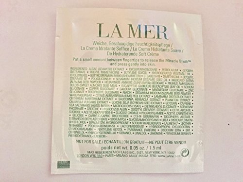 -. Binding : Misc. -. Brand : La Mer -. EAN : 0737993424635 -. Feature : La Mer The Moisturizing Soft Cream Sample Packet 1.5ml. / Lot of 4. / Marked "sample not for sell". -. IsAdultProduct : 0 -. Label : La Mer -. Manufacturer : La Mer -. MPN : LE -. PartNumber : LE -. ProductGroup : Beauty -. ProductTypeName : BEAUTY -. Publisher : La Mer -. Studio : La Mer -. Title : 4 LaMer The Moisturizing Soft Cream Sample Packet 1.5ml each/ 6ml in total by La Me -. UPC : 737993424635