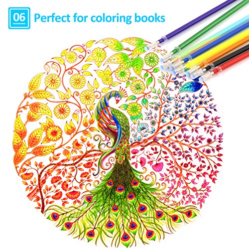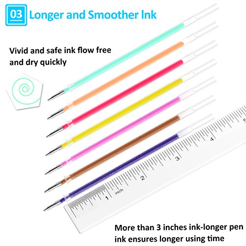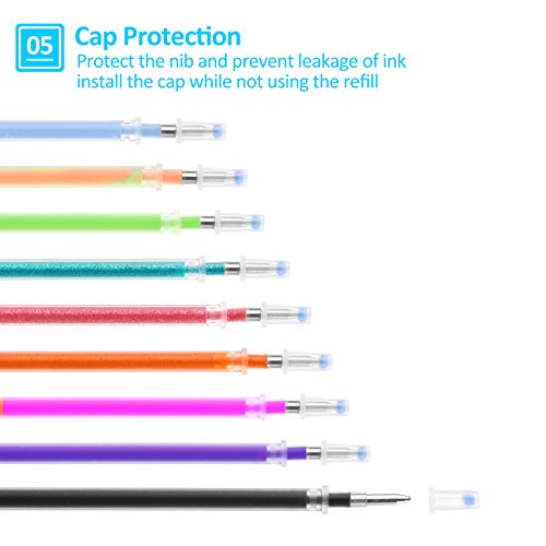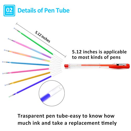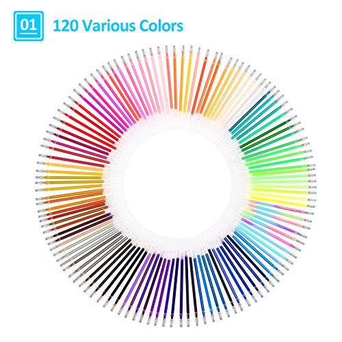 120 Colors Gel Pen Refills: Clear and vibrant colors including Glitter, Metallic, Pastel, Neon, Swirl and Standard colors. Colors include white, brown, blue, black, red, silver, gold, purple, yellow, orange, green, pink, etc.