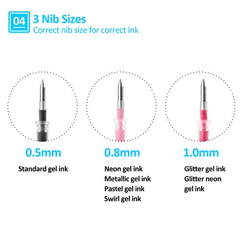 Various Uses: Gel ink refills for gel pens, applicable to MOST brands of pens selling on Amazon. 2 nib sizes- 0.8mm and 1.0mm which make it perfect for adult coloring books, crafting, doodling, scrapbooking, hand-made cards, photo albums, journals and study notes.