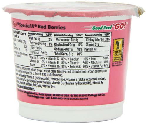 - Feature : Pack of twelve, 2.5-ounce single serve cups of Special K Red Berries Cereal / Deliciously sweet strawberries and crispy rice and whole grain wheat flakes / 3 grams of fiber and 250 calories per 1-cup serving / Good source of whole grains / A vitamin-fortified breakfast cereal for a healthy start to the day