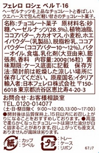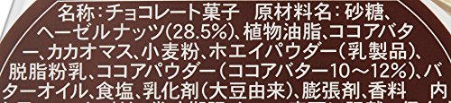原材料:砂糖、ヘーゼルナッツ(28.5%)、植物油脂、ココアバター、カカオマス、小麦粉、ホエイパウダー(乳製品)、脱脂粉乳、ココアパウダー(ココアバター10~12%)、バターオイル、食塩、乳化剤(大豆由来)、膨張剤、香料