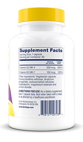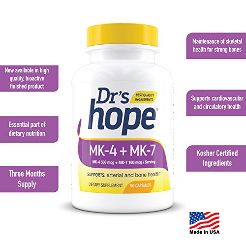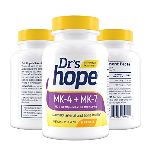 -. Binding : Health and Beauty -. Brand : Dr's Hope -. EAN : 0858157007034 -. Feature : DAILY SUPPLEMENT - supports your body's natural ability to properly regulate and activate important proteins such as clotting factors in the liver, Matrix Gla Proteins found in your arteries, and osteocalcin in bones / FORMULA - consisting of MK4 and MK7, also known as Vitamin K2 and Menaquinone, our capsules provide cardiovascular, skeletal and circulatory support. Our effective combination of ingredients is the perfect source of Vitamin K2 so you can protect your bone and cardiovascular health as you age / SOURCE - vitamin K2 (menaquinone) is naturally found in organ meats such as liver and heart but is also found in egg yolks and dairy products too. Its unique makeup helps to move calcium into areas of your body where it is most needed, including your bones and teeth / VITAMIN K2 - MK4 is important for bone building and collagen production but is less bioavailable at nutritional dose levels. MK7 promotes the formation of additional MK4. MK4 + MK7 are the two best forms and provide the best balance of Vitamin K2 / NATURAL - suitable for vegetarians, our Vitamin K2 capsule supplements contain NO sugar, salt, yeast, wheat, corn, soy or milk. They also contain NO preservatives or artificial colors. We're proud to say that they are made in the USA -. IsAdultProduct : 0 -. Label : Dr's Hope -. Manufacturer : Dr's Hope -. MPN : FS0007 -. PackageQuantity : 90 -. PartNumber : FS0007 -. ProductGroup : Health and Beauty -. ProductTypeName : HEALTH_PERSONAL_CARE -. Publisher : Dr's Hope -. Studio : Dr's Hope -. Title : MK-4 + MK-7 – Vitamin K2 – 90 Capsules – For Cardiovascular and Bone Health by Dr’s Hope -. UPC : 858157007034