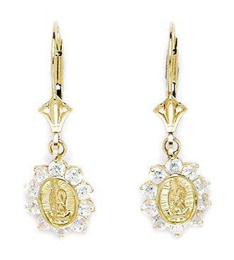 -. Title : 14k Yellow Gold Cubic Zirconia Large Virgin Mary Drop Leverback Earrings - Measures 26x9mm