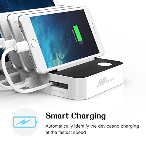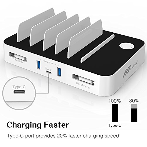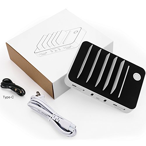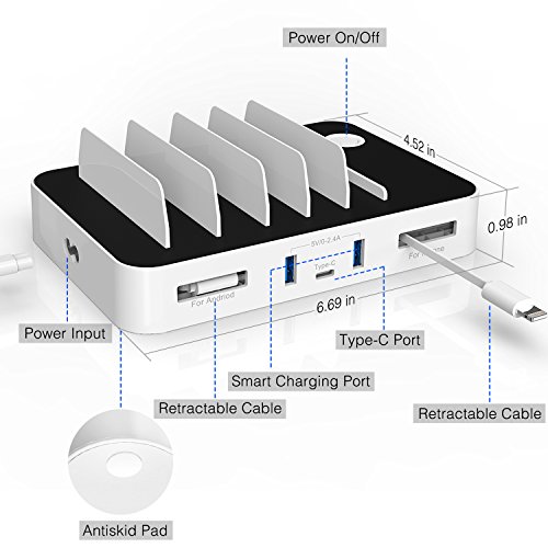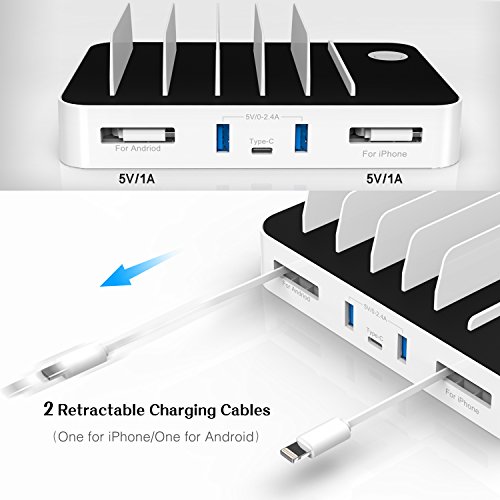 Multi-device Organizer: 5-port, 60W powerful charging station - Innovative Type-C charging port(5V/3A) with 2 Built-in retractable charge cables(2x1A, one for iPhone, one for Android), 2 Smart charging ports(0~2.4A). Allows you to charge up to 5 devices including Type-C enabled devices, smart phones and tablets simultaneously in a compact space.