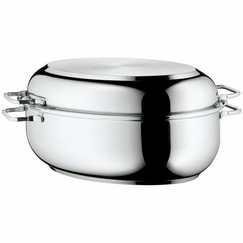 Great for oven-roasting poultry, pot roasts, or cooking on the stovetop, this WMF roasting pan features a high quality 18/10 cromargan stainless steel construction, with WMF's signature transtherm base, suitable for all cooktops. The versatile, dual-handled lid has an identical base; simply turn it over and use it for sauteing vegetables or creating savory gravies or sauces. The stainless steel body has a bright mirror finish, making this gorgeous roaster perfect for oven-to-table serving, as well. Measures 16-1/4-inch long by 11-1/4-inch wide by 7.10-inch high. Dishwasher safe.Feature