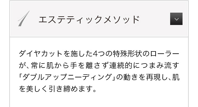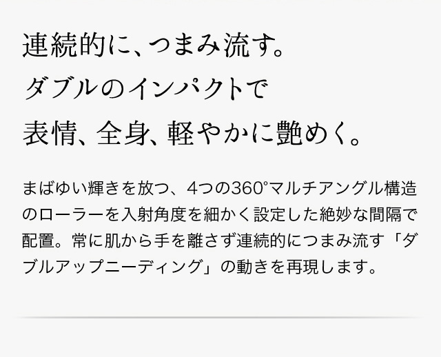 肌を離すことなく、「連続的につまみ流す」動きを再現したダブルアップニーディングで、ゆるみやすい肌を引きよせ、広く、深く、引き締めます。