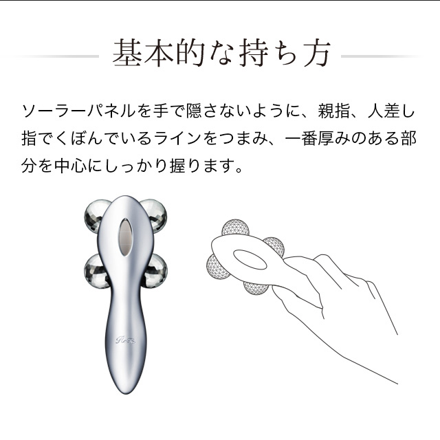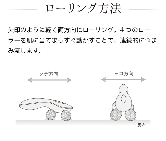 前後に配置されたそれぞれのローラーの入射角度を細かく設定したことで、より効率的に肌を引きよせ、連続して肌をつまみ流すことを可能にしました。また肌状態や部位によって縦・横の2方向へ使用できます。