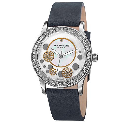 Akribos XXIV Ornate Womens Casual Watch - Mother of Pearl Center Dial - Quartz Movement - Crystal Filled Bezel - Suede Leather Strap