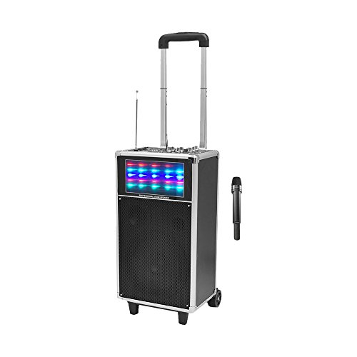 400 Watt Portable PA Speaker System w/USB/SD Readers, FM Radio, 3.5mm Input, Microphone Inputs, VHF Wireless Microphone, Rechargeable Battery & Flashing Lights. USB Flash and SD Card Readers with FM Radio - Built-in Rechargeable Battery - Flashing Disco Lights with Power ON/OFF Switch - Crossover Frequency: 3.5khz - Dimensions: 20.5" (H) x 10.2" (W) x 8.4" (D). Display Screen Shows Number of Songs, Play Time And FM Radio Frequency - One 1/4" Lo-Z Guitar Input With Volume Control - Speaker Input Clips - AC 110v/220V Power SwitchFeature