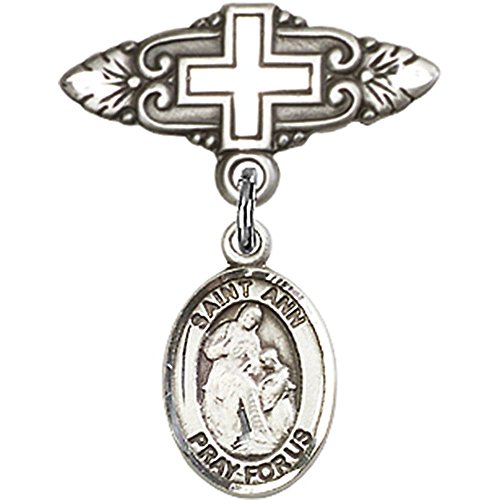 -. Title : Sterling Silver Baby Badge with St. Ann Charm and Badge Pin with Cross 1 X 3/4 inches