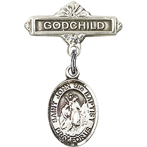 -. Title : Sterling Silver Baby Badge with St. John the Baptist Charm and Godchild Badge Pin 1 X 5/8 inches