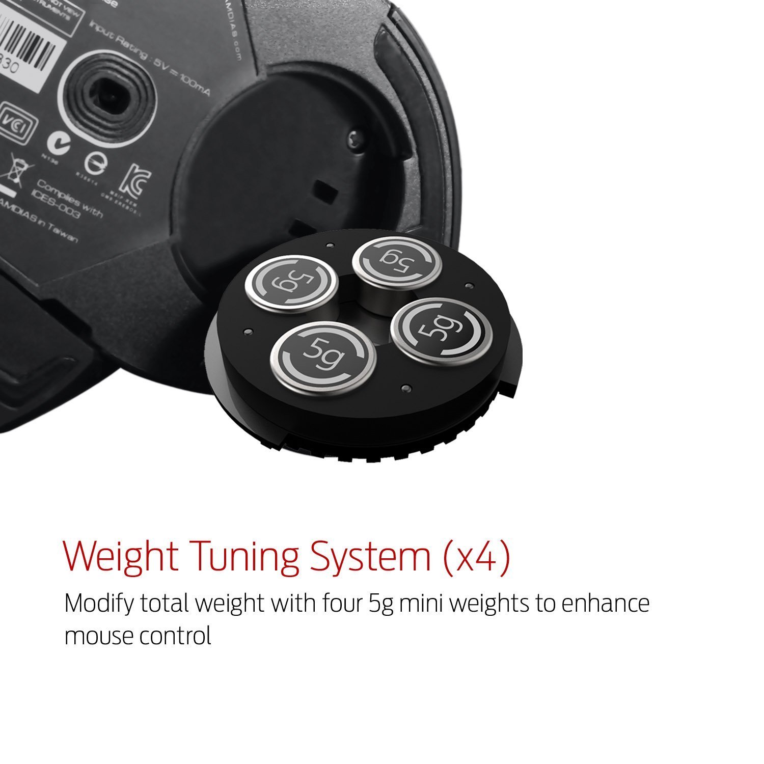 Furthermore, it has not only built-in memory, ergonomic design and LED light, but also the function of six macro setting buttons and weight adjustment system.
