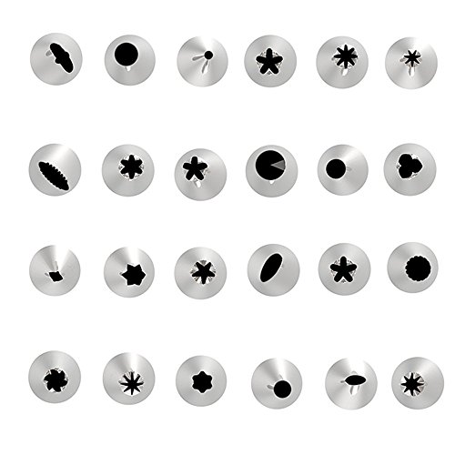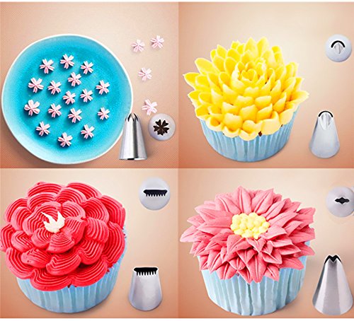 - Cake decorating supplies kits: 24 stainless steel icing tips, 2 reusable silicone pastry bag, 2 reusable plastic couplers, with which you can create all types of patterns on cake, cupcakes, donuts, pastries, cookies and so much more.