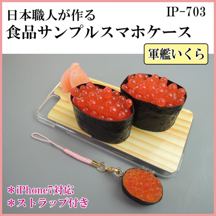 | おいしそうな軍艦いくらをiPhone7ケースに。ミニ軍艦いくらのストラップまで付いています☆見ているだけでお腹が空いてしまうほどのクオリティ!食品サンプル好きにはたまらない商品です。 |