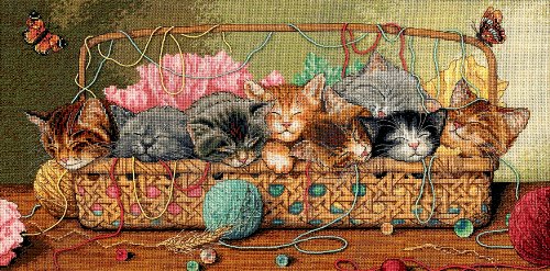 This litter of nine lives is sleeping off a busy day of play and mischief. Stitched in Cross and Half Cross Stitch, this delightful design is perfect for the cat lover in your life. Kit contains cotton thread, 18-count ivory Aida, color-coded thread sorter, needle, and easy instructions. Finished size: 18 by 9 inchesFeature