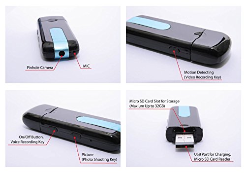 -. Feature : Video And Audio Camera: Real-time Video Recording;The camera record videos every 20 minutes; Video format: AVI;Video resolution: 720x480,Video Frame Rate:25/30fps and it can take photos.Support Audio Recording alone, so you can make voice recording only if you do not need the video. / USB Flash Drive : This camera has real U-Disk USB Flash Drive Function,but you need to correctly insert the SD card to the camera before using. Micro sd card is not included . Sest you to use SDHC4 micro SD card for this camera . Support 32GB TF Card in max / Multi-Functional: It may use like your other u disk, but it has extraordinary capabilities. This is a mini Color U Disk Camera ,Portable Rechargeable Digital Audio Voice Recorder, Support Snapshot, Support Motion Detection Recording / Motion Detection: Support Motion Detecting Recording, it will record only when motion detected. The video file length may vary, depending on whether a movement is detected or not. / Battery Capacity: 300mAh ; Operating Battery Life Time: 90 minutes; Charge Power Voltage: DC 5V ;Charging Time: 2 hours