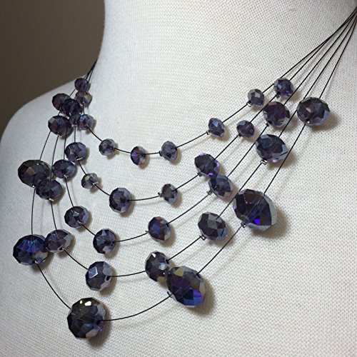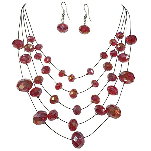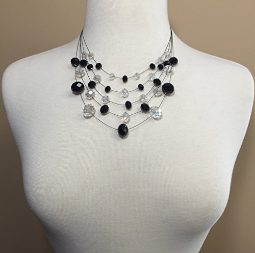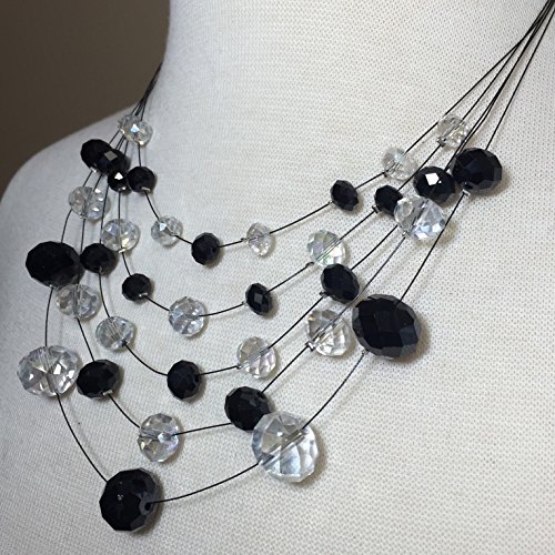 -. Title : Multi Row Glass Beaded Black Illusion Wire Lightweight Necklace and Dangle Earring Set